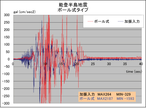 振動実験の結果、通常のボール式や滑走プレート式では加震終了後もいつまでも揺れていたり、
